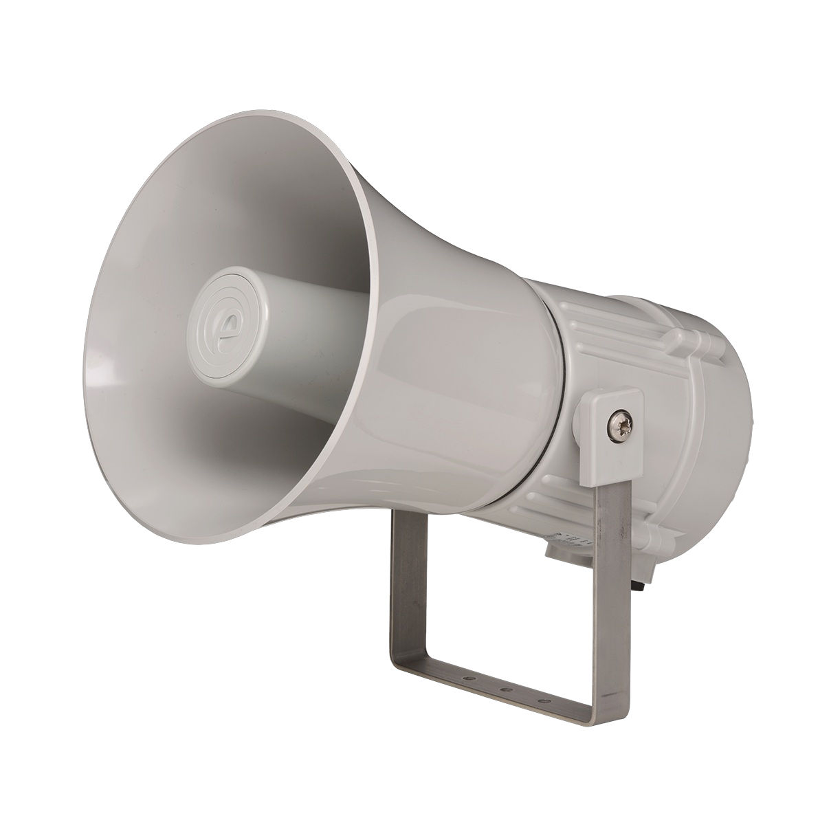 E2S H100T signalling Horn with Trumpet 100dB(A). Compact with high output signal to generate a traditional 'buzzer' warning or two further alarm sounds. Surface Mount. Volume control and Stainless Steel fixings. 12-30VAC/DC or 40-260VAC/DC Versions. IP65. GOST-R Approved.